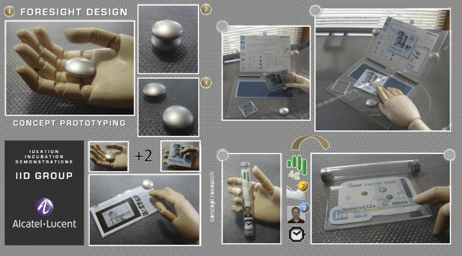 The leading design principle was to decompose mobile phone technology down to its smallest viable form factor, creating an ultra-compact device that could deliver connectivity, communication, and smart services without the bulk of traditional hardware. This research anticipated trends in wearable computing, smart lenses, ambient intelligence, and network-centric design, positioning the concept as a precursor to modern AI devices.