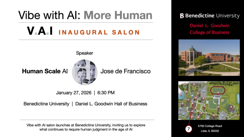 Vibe with AI’s inaugural Salon, VAI, took place at Benedictine University this past Tuesday to focus on unpacking what still requires human consideration and judgement as AI is evolving at unprecedented speed and scale. VAI is an extension of TEDx Naperville’s experience.